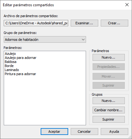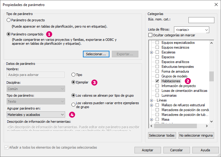Ahora los parámetros compartidos deben añadirse al proyecto y asignarse a la categoría Habitaciones. De este modo, el parámetro aparece en los elementos de habitación del modelo para que pueda rellenar los parámetros con valores.