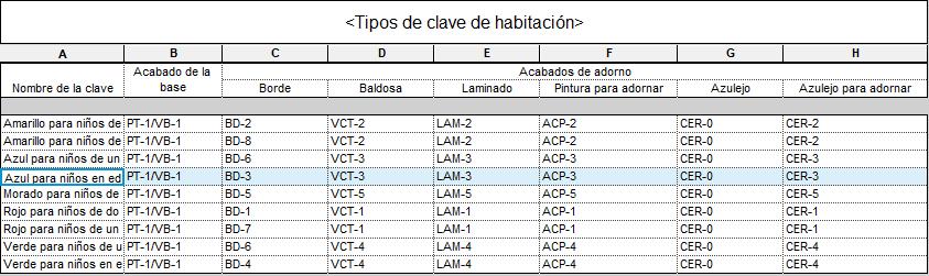 Por ejemplo, utilice una tabla de planificación de claves para elementos como puertas o habitaciones. Las selecciones de accesorios de puerta son exclusivas de una puerta específica y de cómo se utiliza. En lugar de crear un tipo de familia para cada configuración de puerta individual, puede crear una tabla de planificación de claves compuesta por todas las configuraciones de accesorios de puerta y asignar los valores a cada puerta con esa tabla. Las diferentes selecciones de acabados de una habitación también se pueden aplicar de esta forma a los elementos de habitación. Estos son solo dos ejemplos; con algo de imaginación, seguro que descubre nuevas oportunidades de utilizar tablas de planificación de claves.