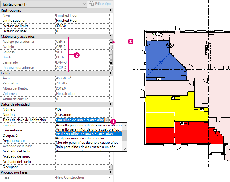 El último paso consiste en aplicar los tipos de clave a las habitaciones. Seleccione un elemento de habitación o varios en el modelo y, en la paleta Propiedades, utilice el menú desplegable de la sección Identidad de la paleta Propiedades