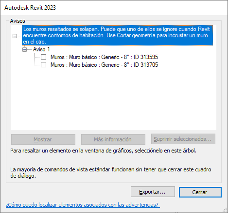 Expanda los elementos para ver los elementos individuales asociados a cada aviso. Al seleccionar el texto que se encuentra cerca del aviso, el elemento se resalta en todas las vistas abiertas en las que se muestre.