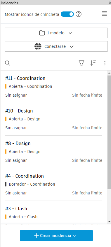 del panel Incidencia para sincronizar los datos entre Autodesk Construction Cloud y el complemento Incidencias de Revit. Consulte Limitaciones del complemento Incidencias para obtener más información sobre las limitaciones asociadas a la creación de incidencias en modelos 3D.