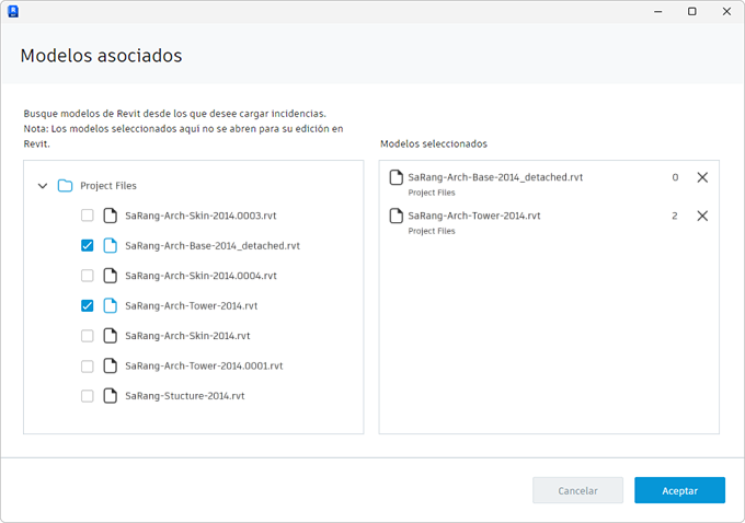 - Expanda la estructura de carpetas para buscar los archivos de Revit (.rvt) que desea asociar al archivo abierto.