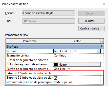 Es posible especificarlo gráficamente para una línea de rejilla individual en una vista o para todas la líneas de rejilla de un tipo concreto, cambiando las propiedades de tipo.