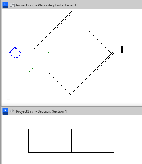 Por ejemplo, el plano de planta mostrado a continuación muestra dos planos de referencia representados como líneas verdes discontinuas. El plano de referencia de la izquierda interseca la línea de sección en ángulo. El plano de referencia de la derecha es perpendicular a la línea de sección. Dado que el plano de referencia en ángulo no es perpendicular a la línea de sección, el plano no es visible en la vista en sección resultante. Pero el plano de referencia perpendicular sí se muestra en dicha vista.