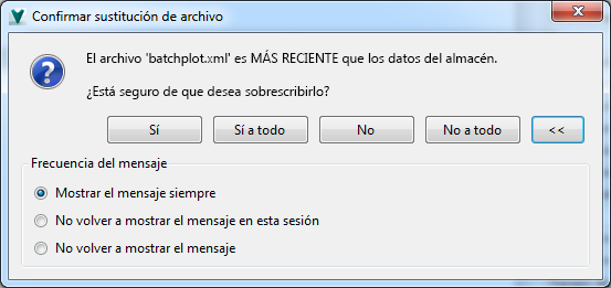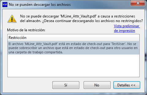 La VDF comprueba si el archivo ubicado en el disco no está sincronizado con la versión del archivo del almacén. En este caso, cabe la posibilidad de indicar si el archivo se debe sobrescribir o si la descarga se debe omitir. La lógica de resolución es ampliable y el valor por defecto de la gestión se puede reemplazar con una solución personalizada. ![]()