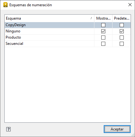 Seleccione Esquemas de numeración para definir los esquemas de asignación de nombres válidos para utilizar en la configuración de Copiar diseño. También se puede definir el esquema de numeración por defecto.