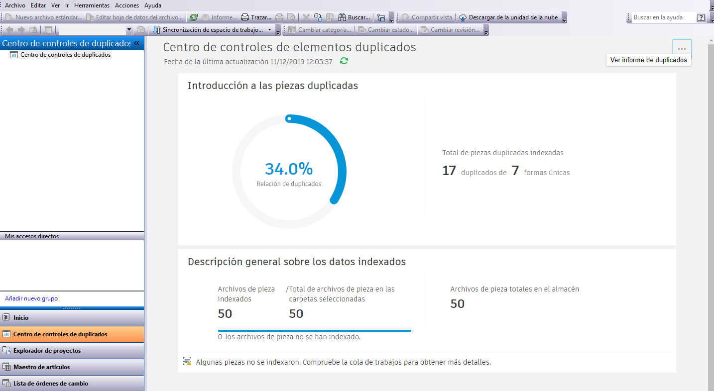 Una vez indexados los archivos, puede ver los datos en el Centro de control de duplicados. En Vault Client, haga clic en Centro de control de duplicados. Puede ver el informe de piezas duplicadas, que también se puede exportar a formato Excel, PDF o Word.