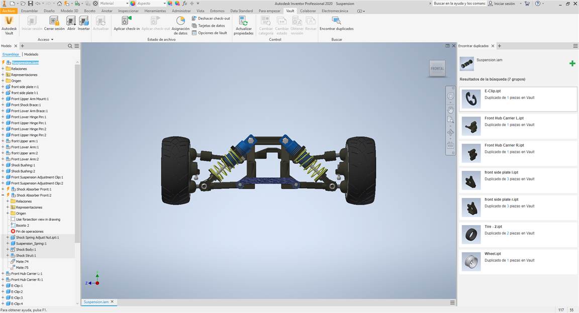 Los duplicados de los archivos de piezas dentro del ensamblaje se muestran en el panel Encontrar duplicados. Cuando se busca dentro de un ensamblaje, los grupos duplicados se muestran primero. Haga clic en el grupo para revisar los archivos de pieza duplicados desde Vault.