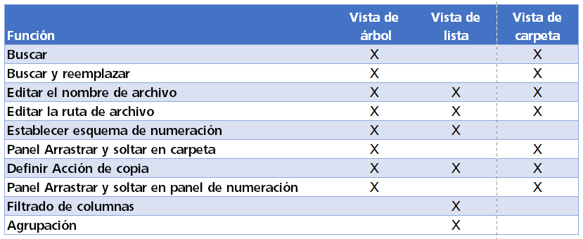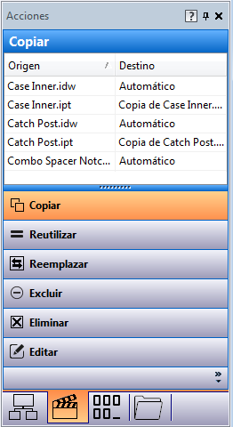El panel Acciones permite revisar las operaciones que están asignadas a los archivos en la vista principal. Una vez que haya configurado los archivos en la vista principal, puede utilizar el grupo Acciones para filtrar los archivos en función de su operación asignada. Las operaciones asignadas pueden ser copiar, reutilizar, reemplazar, excluir, eliminar o editar. Nota: También puede definir operaciones mediante la acción de arrastrar y soltar archivos desde la rejilla principal en la operación deseada, situada en el panel Acciones.