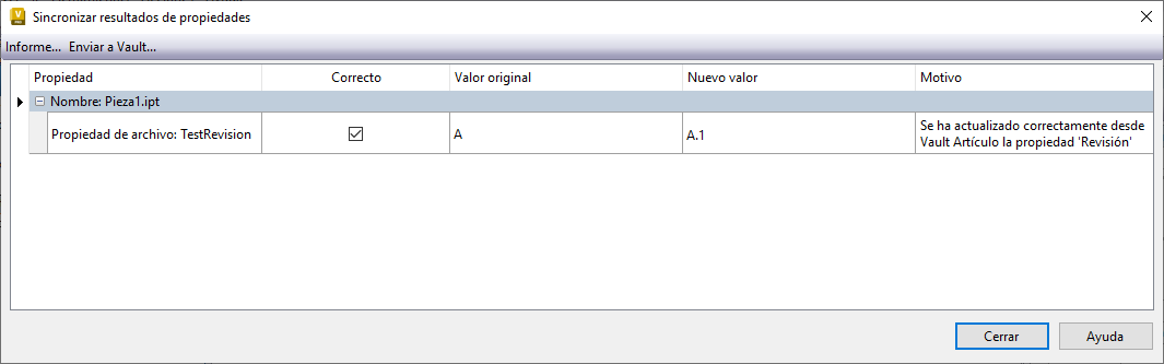 La propiedad de Inventor (propiedad personalizada) siempre se sincronizará con el artículo de Part1 (que se asigna desde el Estado del modelo principal) y, por tanto, TestRevision se revisará a la Revision A.1 después de la sincronización. Sin embargo, la revisión del archivo seguirá siendo la Revision A.