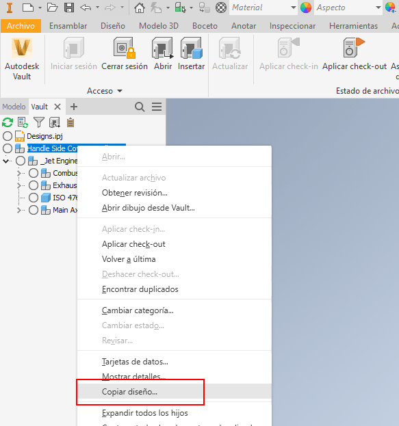 - En Inventor, haga clic con el botón derecho en un archivo en el navegador de Vault y haga clic en Copiar el diseño.