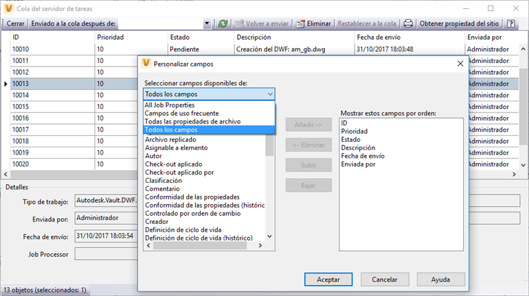 - Otras propiedades de archivo se pueden visualizar como campos en el cuadro de diálogo Cola del servidor de tareas.