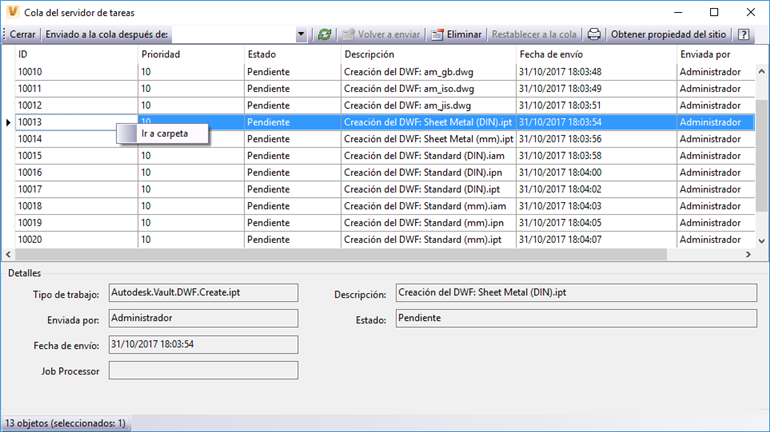 - Haga clic con el botón derecho en un trabajo y seleccione Ir a la carpeta para localizar el archivo en el cliente de Vault.