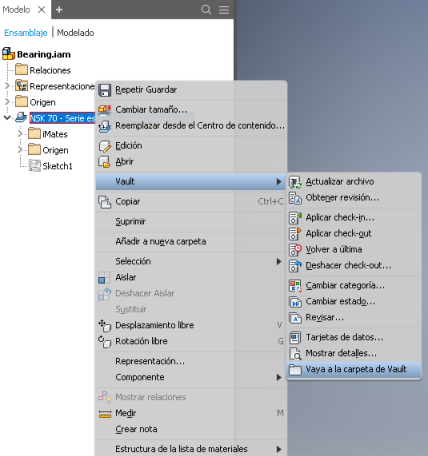 - Haga clic con el botón derecho en un elemento en el navegador del modelo de Inventor y seleccione Ir a la carpeta del almacén para buscar el archivo en el cliente de Vault.