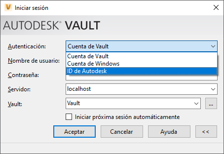 El cuadro de diálogo de inicio de sesión se ha actualizado para admitir el ID de Autodesk como opción de autenticación. La integración del ID de Autodesk con Vault permite a los administradores controlar la autenticación de usuario y el acceso al entorno de Vault.