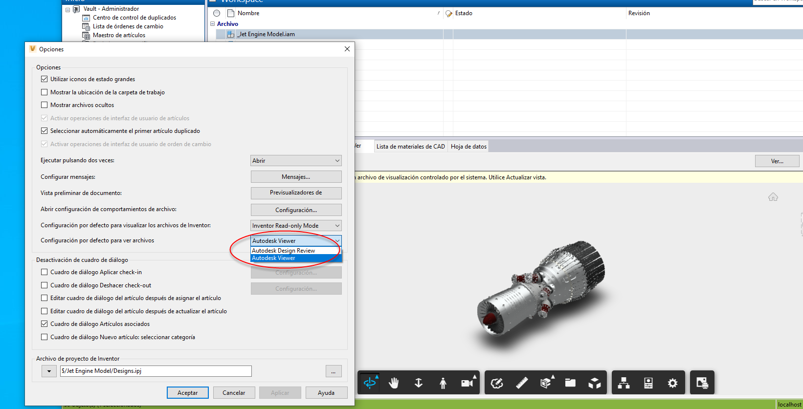 - Seleccionar Autodesk Viewer o Autodesk Design Review (ADR) en Opciones de Vault para ver vistas preliminares de archivos. Por defecto, se utilizará ADR para ver los archivos.