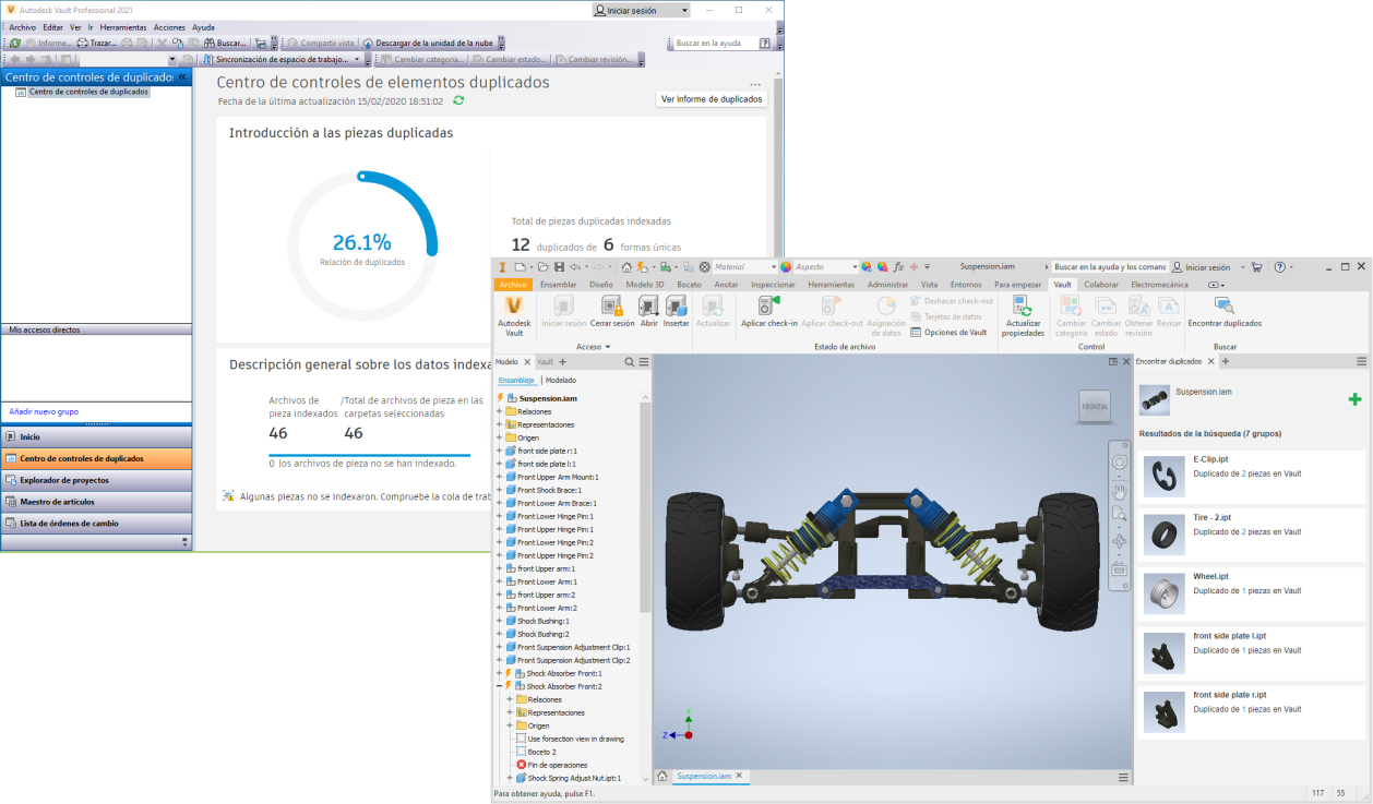 Al igual que una búsqueda de imágenes, pero para los componentes 3D, la búsqueda duplicada de Vault compara de forma inteligente las formas 3D con los miles de archivos CAD que tiene en la base de datos de Vault.