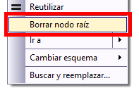 Puede eliminar el nodo raíz y todos sus nodos secundarios del cuadro de diálogo con la opción Borrar nodo raíz del menú de clic derecho. Esta opción solo está disponible si selecciona el nodo raíz.