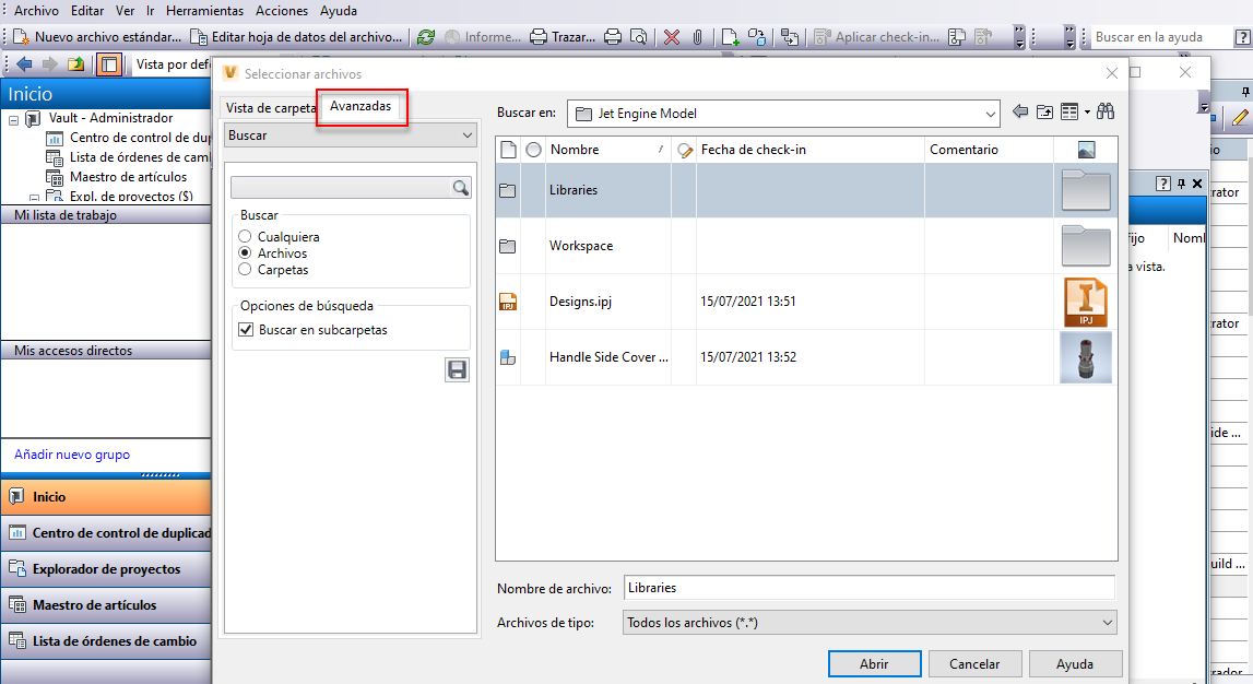 La función de búsqueda avanzada se ha añadido al cuadro de diálogo Seleccionar archivo que se utiliza en Copiar el diseño, Archivos adjuntos, Limpiar, Cambiar nombre, Reemplazar, Elemento, Administrador de trazado y Archivo de proyecto de Inventor por defecto. Utilice los accesos directos y las búsquedas guardadas en la pestaña Avanzadas para obtener resultados de búsqueda rápidos y precisos.