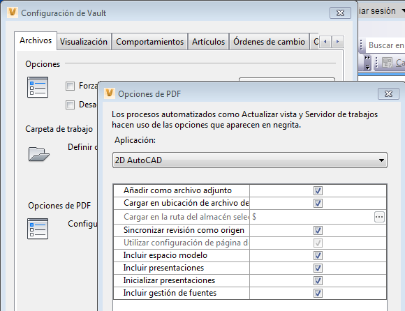 En Vault 2018, los archivos PDF publicados se pueden almacenar de forma automática en el mismo proyecto que los archivos de diseño adjuntos. Los administradores pueden especificar una carpeta para el control de documentos diferente de la carpeta especificada para cada archivo de diseño.