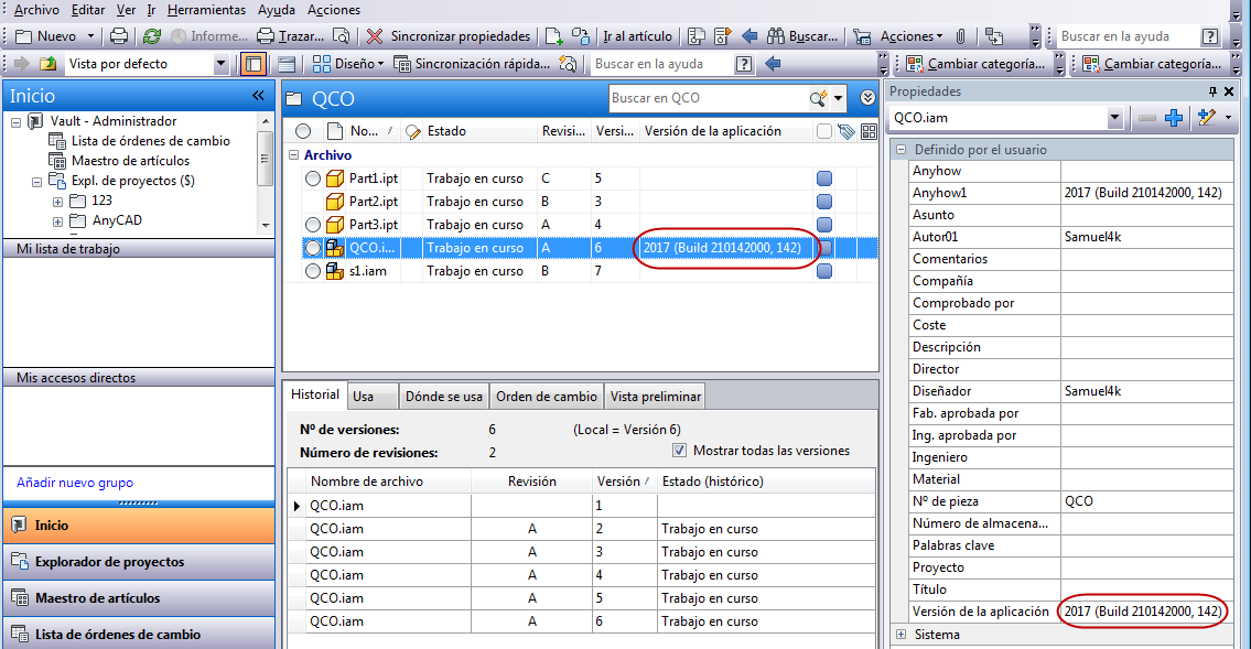 La propiedad de versión de la aplicación actualmente es solo para los archivos de Inventor.