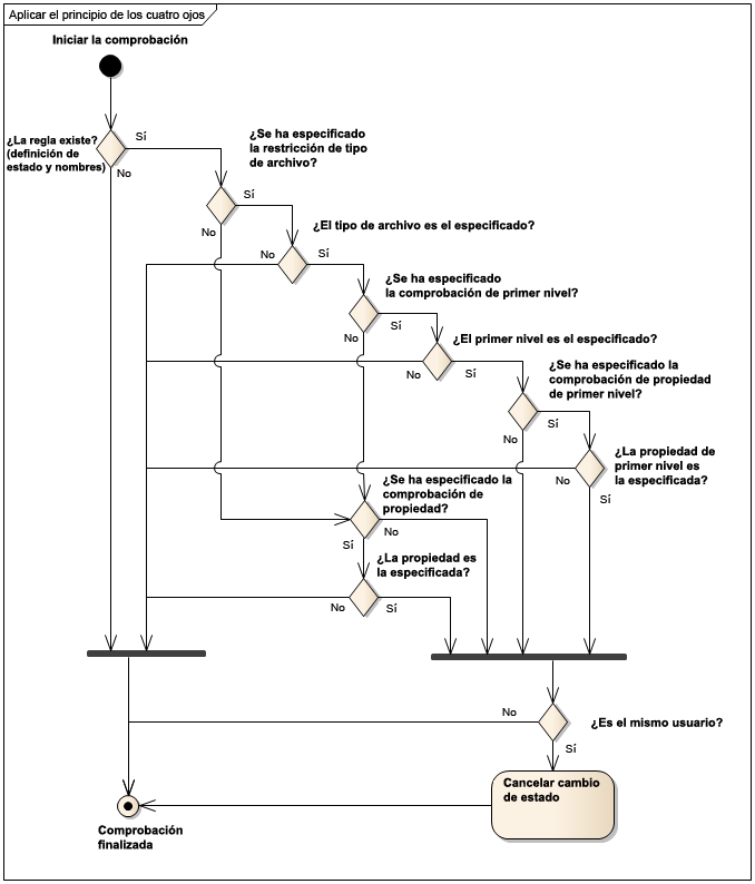 La comprobación se aplica durante un cambio de estado en un documento. Contiene un control si el usuario actual es el mismo usuario que ha realizado el cambio de estado anterior. Contiene dos partes: Comprobación previa y Comprobación del usuario.