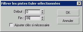 L'intervalle de filtrage par défaut est l'intervalle actif courant de la scène, qui s'affiche automatiquement dans l'utilitaire. Pour appliquer l'opération à un sous-ensemble particulier de l'animation, modifiez les paramètres Début et Fin. Toute modification apportée à l'utilitaire reste active pendant la session de 3ds Max en cours.