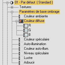 Le contrôleur Couleur RVB fractionne les composantes R, V et B en trois pistes distinctes. Vous pouvez utiliser ce contrôleur avec des pistes de couleur. Par défaut, un contrôleur Flott. Bézier est affecté à chaque piste. Le contrôleur Flott. Bézier est un contrôleur à paramètre unique.