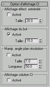 Ce groupe de fonctions dispose des contrôles permettant d'activer et de désactiver différents gizmos dans la fenêtre. Les effecteurs de but et d'extrémité, la poignée vectorielle du manipulateur d'angle plan résolution ainsi que l'affichage de la solution CI figurent tous dans ce panneau déroulant.