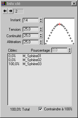 Répertorie toutes les cibles d'interpolation de l'objet, ainsi que le pourcentage de leur effet sur la clé courante. Le pourcentage total de toutes les cibles est affiché au-dessous de la fenêtre. Vous pouvez sélectionner une cible dans cette fenêtre et ajuster ensuite le pourcentage de son effet à l'aide du champ de droite.