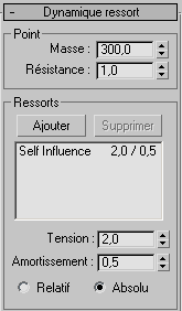 - Répertorie par nom tous les objets à l'extrémité des ressorts, et affiche les paramètres Tension et Amortissement de chacun d'eux séparés par une barre oblique (/). Vous ne pouvez pas supprimer l'élément Auto-influence, qui correspond à l'influence qu'exerce sur lui-même l'objet contrôlé. Toutefois, pour supprimer cette influence, vous pouvez attribuer la valeur 0 aux paramètres Tension et Amortissement, ce qui annule tout mouvement.