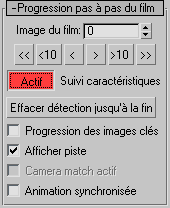 Le panneau déroulant Progression pas à pas de l'utilitaire Détecteur de caméra vous permet de parcourir le film pendant la phase de détection pour définir les images de début et de fin, visualiser les résultats de la détection ou exécuter la détection manuellement sur une série d'images. Il est composé d'un compteur d'images, d'un jeu de boutons de déroulement et de quelques cases à cocher.