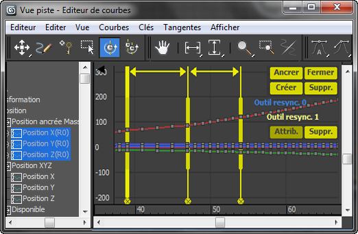 Pour utiliser l'outil de resynchronisation, ouvrez la vue piste en mode Editeur de courbes, puis sélectionnez les pistes à resynchroniser. Ensuite, après avoir activé l'outil, cliquez deux fois dans la fenêtre de l'éditeur de courbes de la vue piste afin de placer des marqueurs de resynchronisation. Chaque paire adjacente de marqueurs verticaux inclut le temps qui les sépare dans les pistes sélectionnées. Vous déplacez ensuite les marqueurs pour modifier la synchronisation de l'animation. Si vous les rapprochez, l'animation s'accélère ; si vous les espacez, l'animation ralentit.