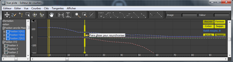 Cela supprime l'influence de la synchronisation sur l'animation des pistes mises en surbrillance. La synchronisation est conservée, mais ne peut pas avoir d'incidence sur le mouvement de l'objet. Les courbes de l'objet disparaissent de la fenêtre Clé afin d'indiquer que l'animation ne peut plus être modifiée avec cette resynchronisation.