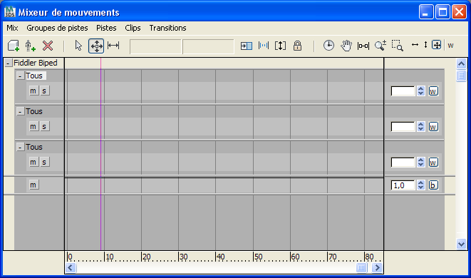 Lors de la création d'un groupe de pistes, une piste de couche lui est affectée par défaut. Cependant, vous pouvez ajouter des pistes supplémentaires à chaque groupe, ce qui rend possible le mixage de mouvements pour chaque ensemble de parties du corps filtrées. Par exemple, vous pouvez créer un groupe de pistes pour les bras et avoir deux pistes de transition dans ce groupe. Vous pouvez ensuite placer deux ensembles de mouvements complètement différents sur chaque piste et utiliser la pondération pour opter pour une piste ou l'autre à différents moments durant le mouvement. Reportez-vous à la rubrique Ajustement du poids d'une piste.