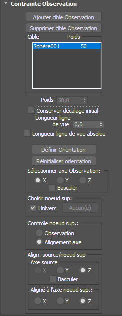 Permet de définir l'axe d'observation de la cible. Les cases à cocher X, Y et Z correspondent au système de coordonnées local de l'objet contraint. La case à cocher Basculer inverse les directions des axes locaux.
