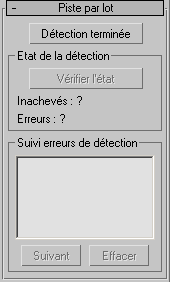 Le panneau déroulant Piste par lot de l'utilitaire Détecteur de caméra effectue une détection automatique une fois les détecteurs configurés. Vous pouvez configurer des détecteurs, démarrer une détection en lot à l'aide de tous les détecteurs et utiliser les autres outils de ce groupe de fonctions pour vérifier et passer en revue les erreurs détectées. Ce groupe de fonctions vérifie aussi l'achèvement de la détection.