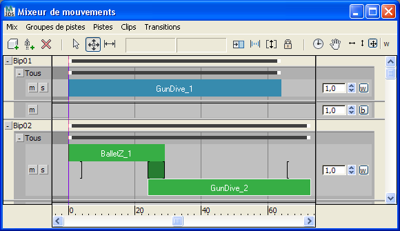 Une couleur aléatoire et unique est affectée à tous les clips importés pour un même objet. Par exemple, tous les clips d'un bipède peuvent être rouges, tandis que ceux d'un autre bipède sont bleus. Cette distinction par couleur permet de travailler plus facilement avec plusieurs objets bipèdes et non bipèdes dans le mixeur de mouvements.