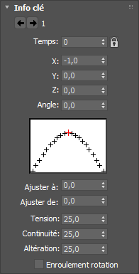 Contrôle les propriétés tangentielles de la courbe au niveau de la clé. Le paramètre par défaut est la seule valeur qui engendre une courbe d'animation lisse aux environs de la clé. Toutes les autres valeurs engendrent une discontinuité de la courbe d'animation, créant de ce fait un changement brusque dans l'animation. Valeur par défaut=25.