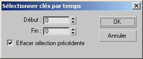 L'utilitaire Sélectionner clés par temps vous permet de sélectionner des clés dans un intervalle de temps spécifié. La sélection d'un intervalle de temps important peut s'avérer difficile à réaliser avec la souris dans la fenêtre Clé vue piste, par exemple.