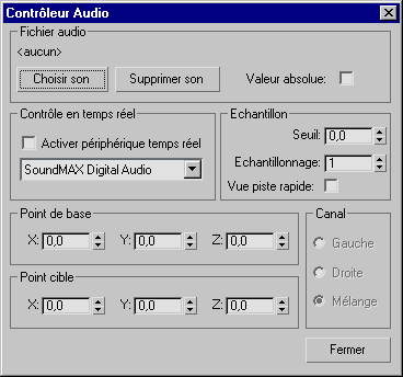 Utilisez cette zone pour créer une animation interactive qui sera contrôlée par des sons enregistrés à partir d'une source audio externe telle qu'un microphone. Utilisez ces options uniquement pour des présentations interactives. Vous ne pouvez pas enregistrer le son en temps réel ou enregistrer l'animation créée par le contrôleur.
