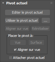 Alors que les commandes du groupe de fonctions Editer pivot (Placer pivot actuel dans la vue et Placer pivot actuel sur la surface) désactivent automatiquement l'option Aligner sur vue. Les commandes Placer pivot actuel dans la vue et aligner et Placer pivot actuel sur la surface et aligner la désactivent.