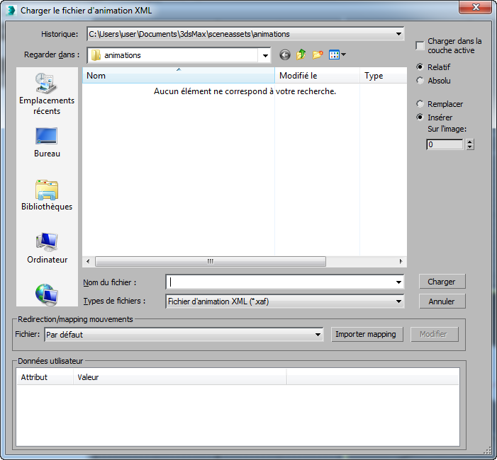 La commande Charger animation permet d'appliquer une animation à partir d'un fichier XAF (Fichier d'animation XML) aux objets de votre scène. Une partie de la procédure de chargement de l'animation consiste à mapper l'animation, c'est-à-dire à spécifier les objets de la scène destinés à recevoir les pistes de l'animation chargée.