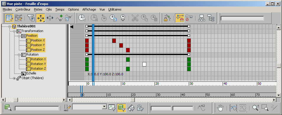 L'éditeur de feuille d'expo utilise la vue piste pour afficher les clés d'animation dans le temps sur un graphique horizontal. Cet affichage graphique simplifie le processus d'ajustement des animations, car il permet de visualiser toutes les clés en même temps dans un même format de feuille de calcul. L'autre mode de la vue piste est l'Editeur de courbes, qui permet de travailler avec des courbes d'interpolation en plus des clés.