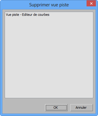 La commande Supprimer vue piste affiche la boîte de dialogue Supprimer vue piste, ce qui permet de supprimer une ou plusieurs fenêtres de vue piste stockées.