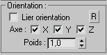 Utilisez les options relatives à des axes déterminés et les options de pondération pour associer chaque liaison à des poids différents et pour identifier l'axe affecté par l'objet de contrôle lié. Utilisez les boutons " Relatif " pour établir un décalage relatif avec Lier position et Lier orientation.