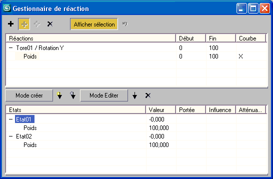 Le mode Créer permet de manipuler les pistes de réaction pour tous les objets lors de la création d’un état. Lorsqu’il est désactivé, la manipulation se limite au contrôleur de réaction.