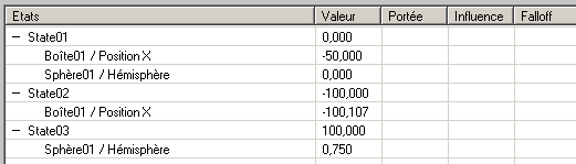 Le gestionnaire de réaction ajoute un nouvel état avec une valeur d'état (glissière) égale à 100.0 et une valeur Hémisphère / Sphère01 égale à 0.750.