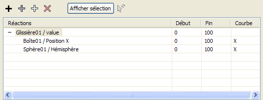 Dans la liste Réactions, l’entrée du contrôleur de réaction Glissière01/valeur apparaît.