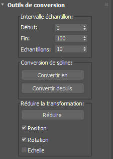 - Définit le nombre d'échantillons utilisés pour la conversion. Lorsque vous effectuez une conversion dans une direction quelconque, la source est échantillonnée à intervalles réguliers et les clés ou les points de contrôle sont créés sur l'objet cible.